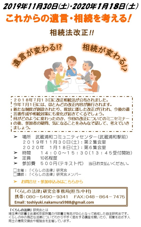 弊所の所属する「くらしの法律」研究会が、相続や遺言、成年後見制度に関する相談会を開催しています。相続法も改正され、相続対策も見直しが必要なケースも想定されます。いまさらこんなこと聞けない!?と思ってしまうような、基本的なこともどんどんご相談ください。